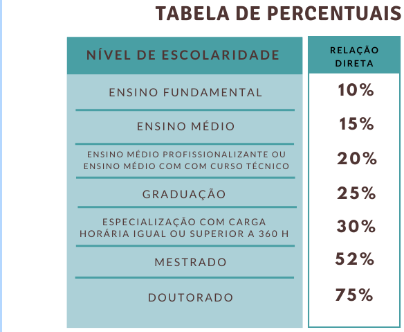 Os percentuais não são acumuláveis e serão incorporados aos proventos de aposentadoria ou pensão se obtidos até a data da aposentadoria ou da pensão (consulte a Tabela de percentuais de Incentivo à Qualificação no infográfico no final da página).